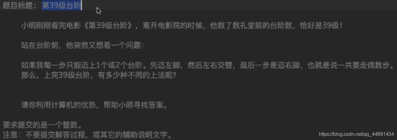//去掉一个条件:偶数步, 只问只能迈上1个或2个台阶的条件下共有多少种走法呢? // f(n=39){return f(n-1)+f(n-2)} #include<iostream> using namespace std; int ans; void f(int n,int step){//n 剩下的阶梯数 step 已走的步数 if( n<0 ){ return; } if( n==0 && step%2==0 ){ ans++; return; } f(n-1,step+1); f(n-2,step+1); } int main(){ f(39,0); cout << ans<< endl; return 0; }