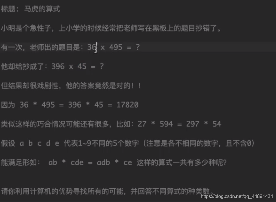 #include<iostream> using namespace std; int main(){ int f=0; for( int a=1;a<10;++a){ for(int b=1;b<10;++b){ if(b!=a){ for( int c=1;c<10;++c){ if( c!=a && c!=b){ for(int d=1;d<10;++d){ if( d!=a&&d!=b&&d!=c){ for(int e=1;e<10;++e){ if( e!=a&&e!=b&&e!=c&&e!=d){ if((a*10+b) * (c*100+d*10+e) == (a*100+d*10+b)*(c*10+e)) f++; } } } } } } } } } cout << f << endl; return 0; }