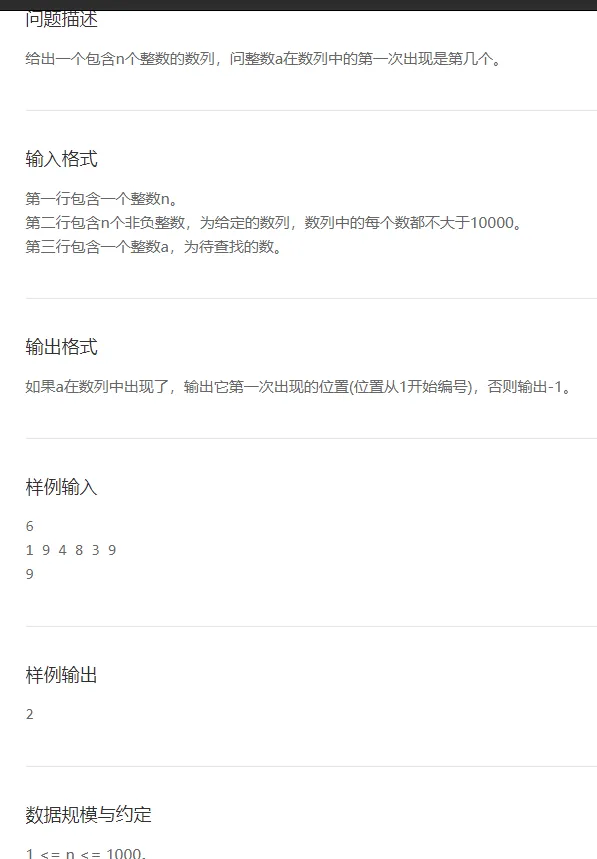 #include<iostream> using namespace std; int main(){ int n,i,a[1000],f,p = 0; cin >> n; for( i=0;i<n;i++){ cin >> a[i]; } cin >> f; for( i=0;i<n;i++){ if(a[i] == f){ p = i + 1; break; }else { p = -1; } } cout << p <<endl; return 0; }