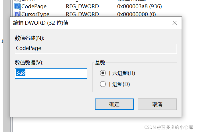新建一个 DWORD(32位值),命名为CodePage,值设为65001,如果已经有CodePage,右击修改即可。