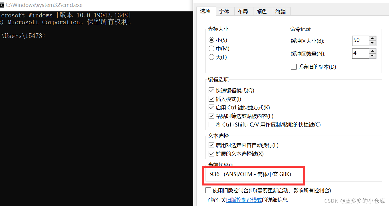 在控制台cmd右击--->属性---->选项,即可查看当前代码页的编码方式,如下图所示,为GBK