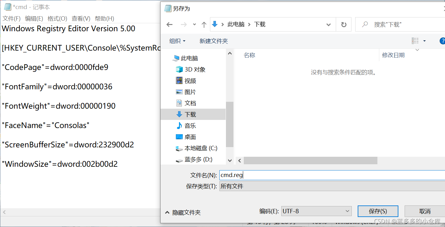 另存为(文件名为cmd.reg,保存类型选择所有文件,编码选择UTF-8):