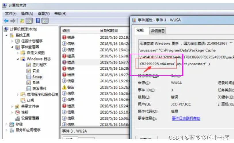 1、打开计算机管理,查看电脑日志文件:右击此电脑-->管理-->系统工具-->事件查看器-->Windows日志-->Setup。