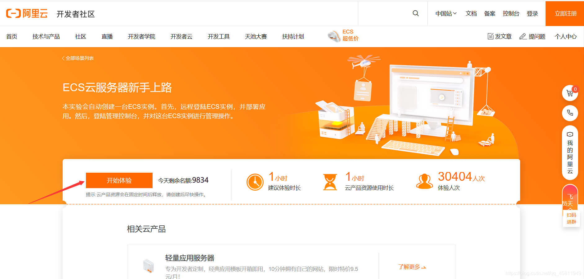 首先通过阿里云ECS服务器体验链接进入体验页面,点击开始体验即可进入体验环节(友情提醒:需要登录阿里云账号才能体验哦)
