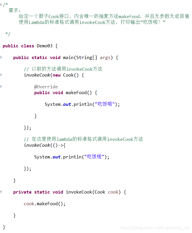 public class Demo03 { public static void main(String[] args) { // 在这里使用lambda的标准格式调用invokeCook方法 } private static void invokeCook(Cook cook) { cook.makeFood(); } }