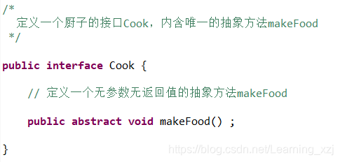 题目:给定一个厨子‘ Cook ’接口,内含唯一的抽象方法 makeFood ,且无参数,无返回值,如下