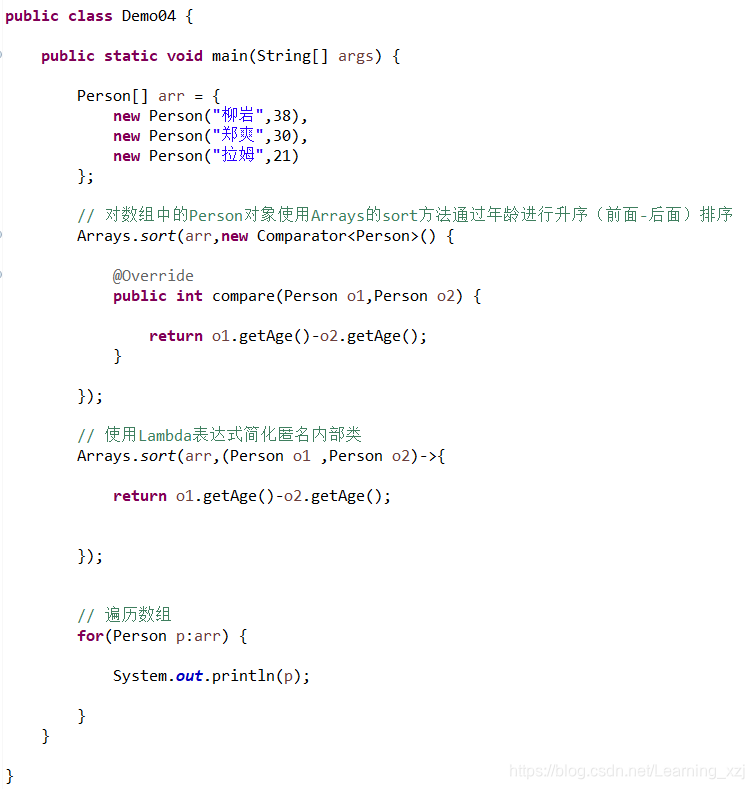 需求: 使用数组存储多个Person对象,对数组中的Person对象使用Arrays的sort方法通过年龄进行升序排序