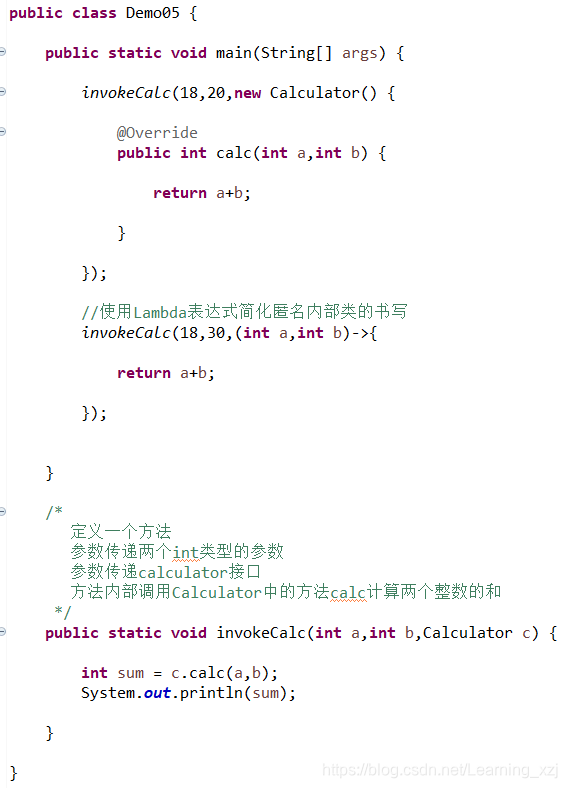 题目:给定一个计算器Calculator接口,内含抽象方法calc,可以将两个int数字相加得到和值