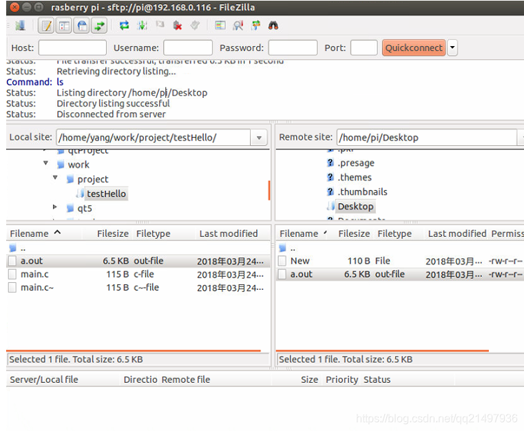 输出a.out,准备放到目标机验证,使用FileZilla(参照FileZilla远程传送)传送a.out文件到是树莓派桌面(树莓派需要启动ssh服务,可参照《树莓派开发笔记(一):入手树莓派3b,成功运行树莓派系统》中的“配置ssh服务”。