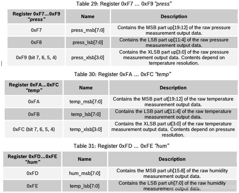 BME280模块,设备地址默认为0x77。下面是读取数据的指令,数据的读出是从0xf7到0xfc读做(温度和压力)或从0xf7到0xfe(温度、压力、湿度等)数据以无符号形式读出。