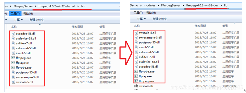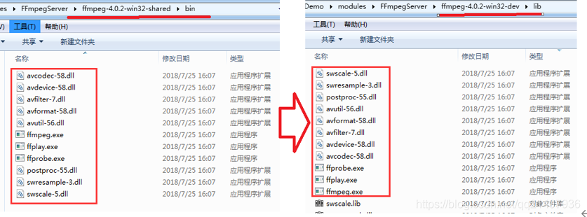 - Shared(动态库版本):里面除了3个应用程序:ffmpeg.exe,ffplay.exe,ffprobe.exe之外,还有一些动态dll,比如说avcodec-54.dll之类的。Shared里面的exe体积很小,他们在运行的时候,到相应的dll中调用功能。程序运行过程必须依赖于提供的dll文件,开发程序是必须下载该版本,因为只有该版本中有dll动态库(dev开发者版本中不包含)
