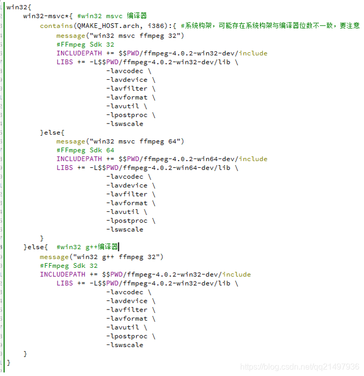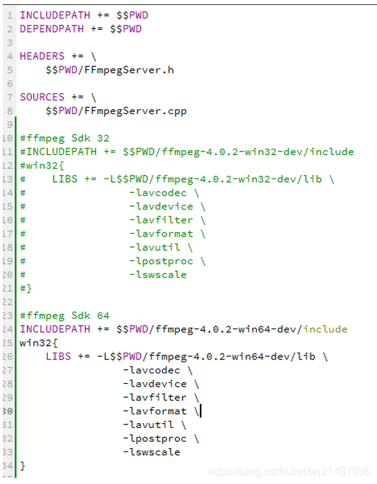 INCLUDEPATH += $$PWD/ffmpeg-4.0.2-win32-dev/include LIBS += -L$$PWD/ffmpeg-4.0.2-win32-dev/lib \ -lavcodec \ -lavdevice \ -lavfilter \ -lavformat \ -lavutil \ -lpostproc \ -lswscale