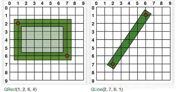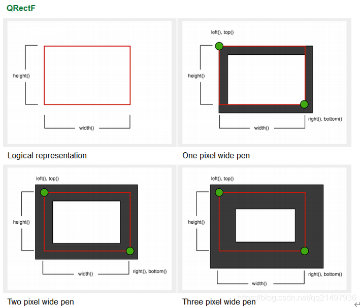 QRect::right()函数返回left()+width()-1,bottom()函数返回top()+height()-1。图中右下角的绿点显示了这些函数的返回坐标。