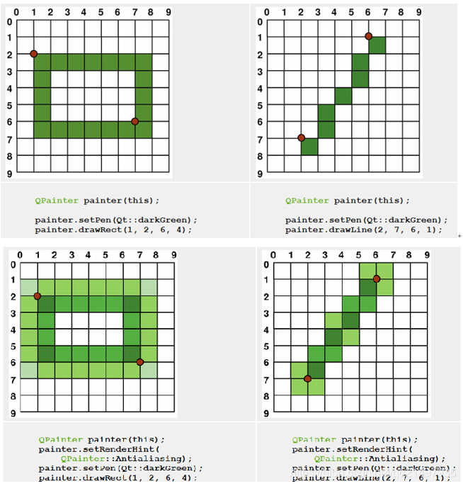 如果设置QPainter的抗混叠渲染,像素将在数学定义的点的两侧对称渲染: