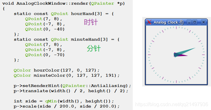 通过旋转坐标系并调用QPainter::drawConverExpolygon()来绘制时钟的时针。感谢旋转,它画的方向是正确的。