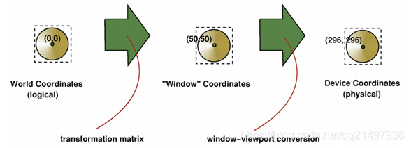 视区、“窗口”和转换矩阵决定逻辑QPainter坐标如何映射到绘制设备的物理坐标。默认情况下,世界变换矩阵是标识矩阵,“窗口”和“视区”设置等同于绘制设备的设置,即世界,“窗口”和设备坐标系是等效的,但正如我们所看到的,可以使用变换操作和窗口视区转换来操纵系统。上图描述了这个过程。