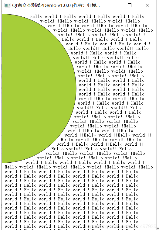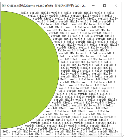 void LayoutWidget::paintLayout() { QString text = "Hello world!!!"; for(int index = 0; index < 200; index++) { text += "Hello world!!!"; } QFont font = this->font(); QTextLayout textLayout(text, font); qreal margin = 10; qreal radius = qMin(width()/2.0, height()/2.0) - margin; QFontMetrics fm(font); qreal lineHeight = fm.height(); qreal y = 0; textLayout.beginLayout(); while(true) { // 创建一根直线 QTextLine line = textLayout.createLine(); if (!line.isValid()) { break; } // 计算椭圆有边界x的值 qreal x1 = qMax(0.0, pow(pow(radius,2)-pow(radius-y,2), 0.5)); qreal x2 = qMax(0.0, pow(pow(radius,2)-pow(radius-(y+lineHeight),2), 0.5)); qreal x = qMax(x1, x2) + margin; qreal lineWidth = (width() - margin) - x; // 设置每一行textLine的右边的开始坐标 line.setLineWidth(lineWidth); line.setPosition(QPointF(x, margin+y)); y += line.height(); } textLayout.endLayout(); QPainter painter; painter.begin(this); painter.setRenderHint(QPainter::Antialiasing); painter.fillRect(rect(), Qt::white); painter.setBrush(QBrush(Qt::black)); painter.setPen(QPen(Qt::black)); textLayout.draw(&painter, QPoint(0,0)); painter.setBrush(QBrush(QColor("#a6ce39"))); painter.setPen(QPen(Qt::black)); painter.drawEllipse(QRectF(-radius, margin, 2*radius, 2*radius)); painter.end(); }