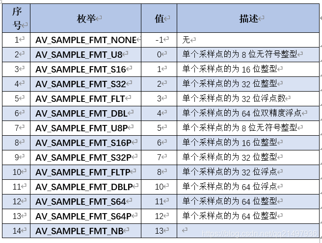 带P和不带P,关系到了AVFrame中的data的数据排列,不带P,则是LRLRLRLRLR排列,带P则是LLLLLRRRRR排列,若是双通道则带P则意味着data[0]全是L,data[1]全是R(注意:这是采样点不是字节),PCM播放器播放的文件需要的是LRLRLRLR的。 - 参数四:输出的采样率(转换后的)