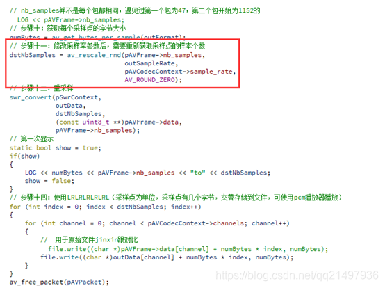 使用冲残阳函数结合转换结构体对编码的数据进行转换,拿到重采样后的音频原始数据。