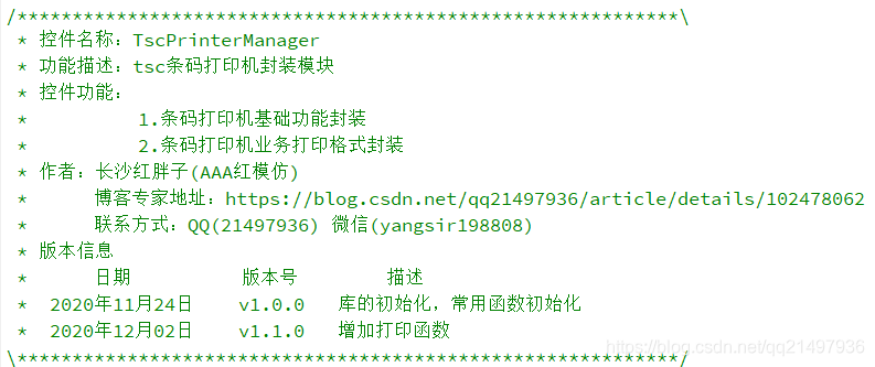 class TscPrinterManager : public QObject { Q_OBJECT private: explicit TscPrinterManager(QObject *parent = 0); signals: public slots: public: static TscPrinterManager *getInstance(); public: bool initPrinter(); void abount(); void test(); bool printHengYaHanJieFa(QString vType, int v1, int v2, int v3, int v4, int vS1, int vS2, int vS3, int vS4, QString model, int num); bool printHengLiuHanJieFa(QString vType, int v1, int v2, int v3, int v4, int vS1, int vS2, int vS3, int vS4, QString model, int num); QString getDevName() const; void setDevName(const QString &devName); private: QLibrary _library; QString _libName; QString _devName; QTextCodec *_pTextCodec; private: // 打印机函数 文档中共20个函数,当前初始化13个 function_about _pFunAbout; function_openport _pFunOpenPort; function_closeport _pFunClosePort; function_barcode _pFunBarcode; function_clearBuffer _pFunClearBuffer; function_downloadpcx _pFunDownLoadPcx; function_formfeed _pFunFromFeed; function_nobackfeed _pFunNobackFeed; function_printerfont _pFunPrinterFont; function_printlabel _pFunPrintLabel; function_sendcommand _pFunSendCommand; function_setup _pFunSetup; function_windowsfont _pFunWindowsFont; function_windowsunicode _pFunWindowsUnicode; private: static TscPrinterManager *_pInstance; static QMutex _mutex; };