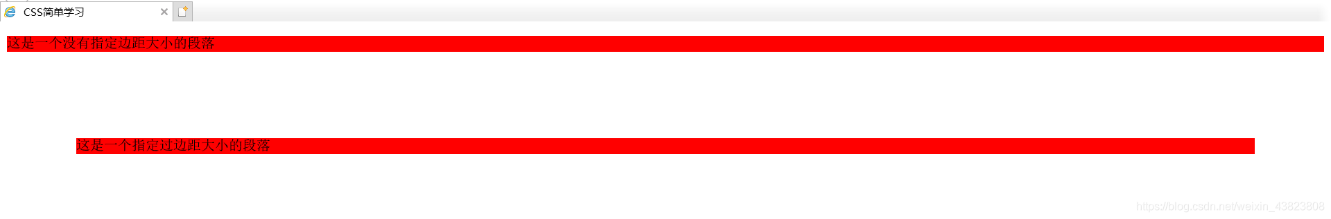 <!DOCTYPE html> <html lang="en"> <head> <meta charset="utf-8" /> <title>CSS简单学习</title> <style type="text/css"> p.nomargin { background-color: #FF0000 } p.margin { background-color: #FF0000; margin-top: 100px; margin-bottom: 100px; margin-left: 80px; margin-right: 80px; } </style> </head> <body> <p class="nomargin">这是一个没有指定边距大小的段落</p> <p class="margin">这是一个指定过边距大小的段落</p> </body> </html>