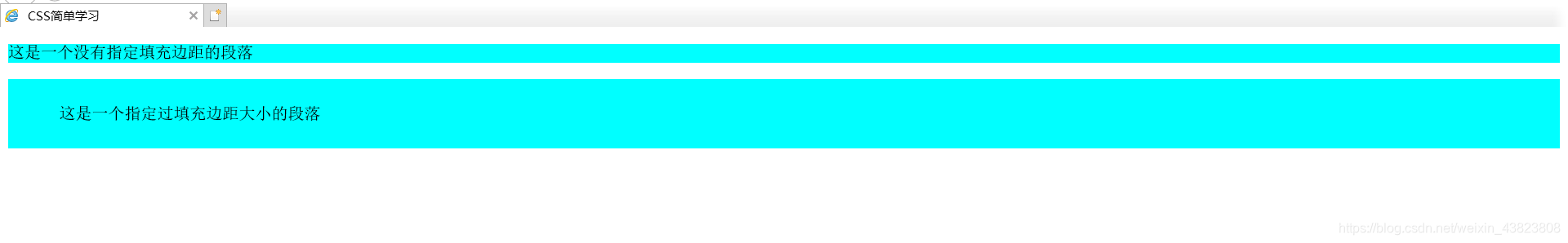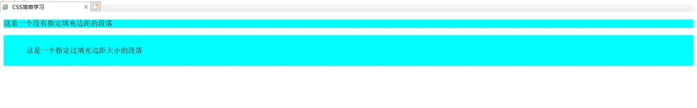 <!DOCTYPE html> <html lang="en"> <head> <meta charset="utf-8"> <title>CSS简单学习</title> <style type="text/css"> p.nopadding { background-color: #00FFFF; } p.padding { background-color: #00FFFF; padding-top: 25px; padding-bottom: 25px; padding-left: 50px; padding-right: 50px; } </style> </head> <body> <p class="nopadding">这是一个没有指定填充边距的段落</p> <p class="padding">这是一个指定过填充边距大小的段落</p> </body> </html>