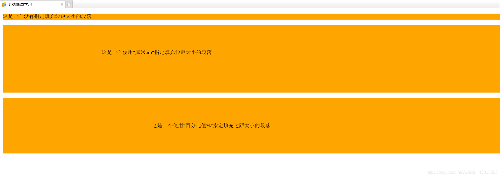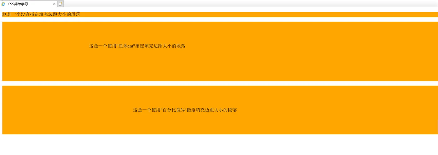 <!DOCTYPE html> <html lang="en"> <head> <meta charset="utf-8"> <title>CSS简单学习</title> <style type="text/css"> p { background-color: orange; } p.ex1 { padding: 2cm 6cm 3cm 8cm; } p.ex2 { padding: 5% 30%; } </style> </head> <body> <p>这是一个没有指定填充边距大小的段落</p> <p class="ex1">这是一个使用"厘米cm"指定填充边距大小的段落</p> <p class="ex2">这是一个使用"百分比值%"指定填充边距大小的段落</p> </body> </html>
