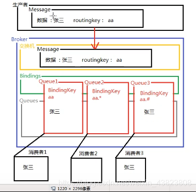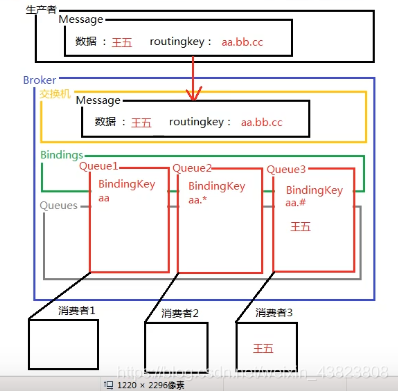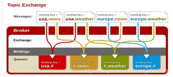 topic 交换器通过模式匹配分配消息的路由键属性,将路由键和某个模式进行匹配,此时队列需要绑定到一个模式上。它将路由键和绑定键的字符串切分成单词,这些单词之间用点隔开。它同样也会识别两个通配符:符号“#”和符号“*”。#匹配0个或多个单词,“*”匹配不多不少一个单词。
