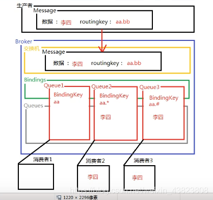 Topic交换机:基本概念和使用Fanout基本是相同的,但是Topic需要指定BindingKey,消息中也需要携带RoutingKey,但是Topic中的BindingKey时刻一使用通配符的,* 表示必须要匹配一个单词,#可以匹配0个或多个担此,每个单词之间需要使用 . 来分隔,例如:aa、aa.bb、aa.bb.cc。