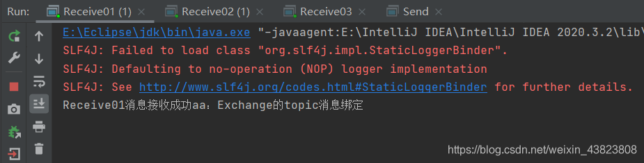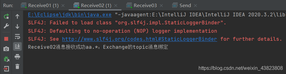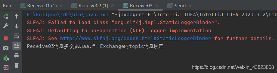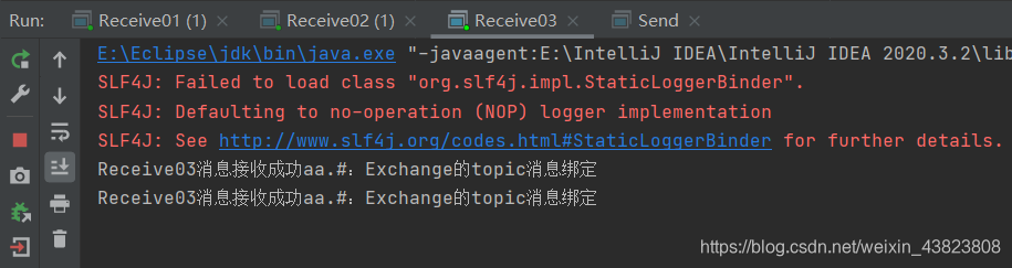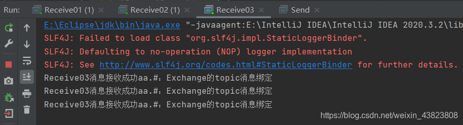 消息发送类中,有三行basicPublish方法代码,分别表示三个不同的RoutingKey,先打开第一行的,然后运行。此时因为RoutingKey是 aa,它所能匹配到的只有Receive01、Receive03,因为Receive01的BindingKey是 aa,自然可以完成匹配,同时也只能匹配RoutingKey为 aa 的消息队列;Receive03的BindingKey是 aa.#,这个#表示匹配0个或多个单词,所以也可以完成匹配,它可能匹配的消息队列的RoutingKey可以是 aa、aa.bb、aa.bb.cc这些;只有Receive02不行,因为它的BindingKey是 aa.*,这个*表示仅能匹配1个单词,也就是说它只能匹配的RoutingKey为 aa.bb这种形式。