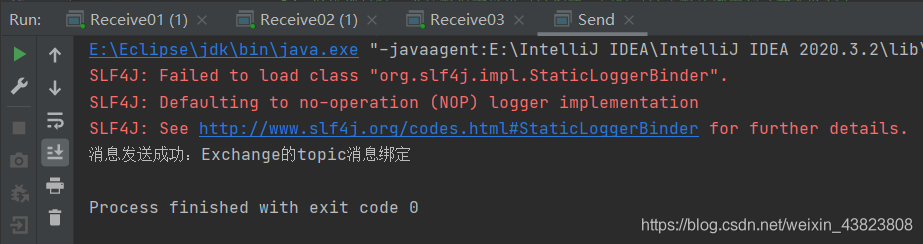 下面我们来测试,测试的时候,先依次启动三个消息接收类,使它们提前处于监听消息队列的状态,然后再启动消息发送类。