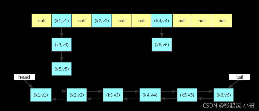 LinkedHashMap的大致实现如下图所示,当然链表和哈希表中相同的键值对都是指向同一个对象,这里把它们分开来画只是为了呈现出比较清晰的结构。