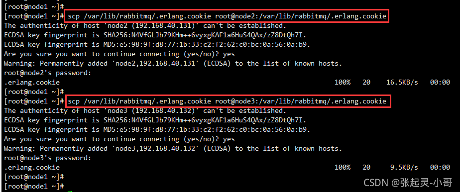 scp /var/lib/rabbitmq/.erlang.cookie root@node2:/var/lib/rabbitmq/.erlang.cookie scp /var/lib/rabbitmq/.erlang.cookie root@node3:/var/lib/rabbitmq/.erlang.cookie