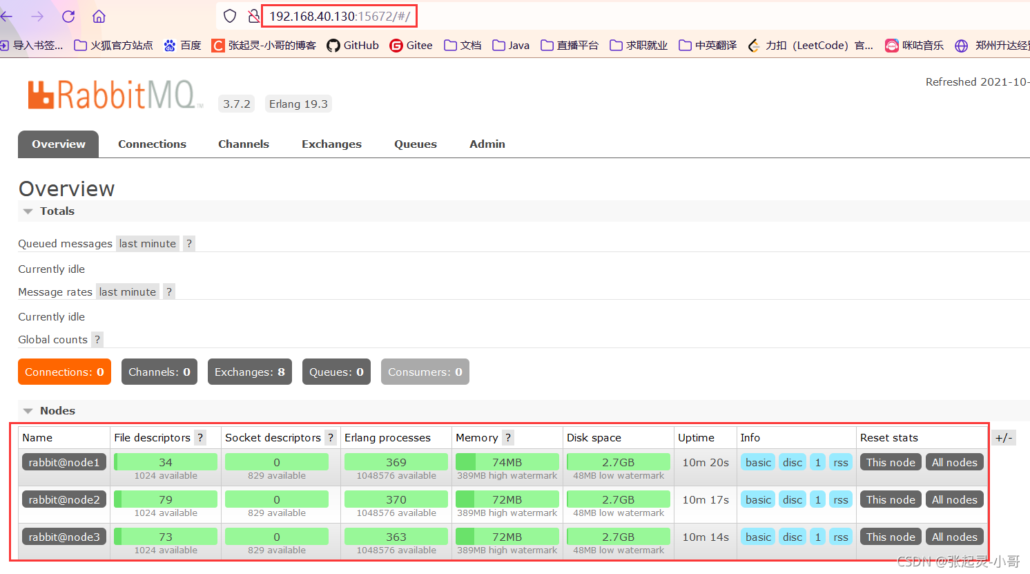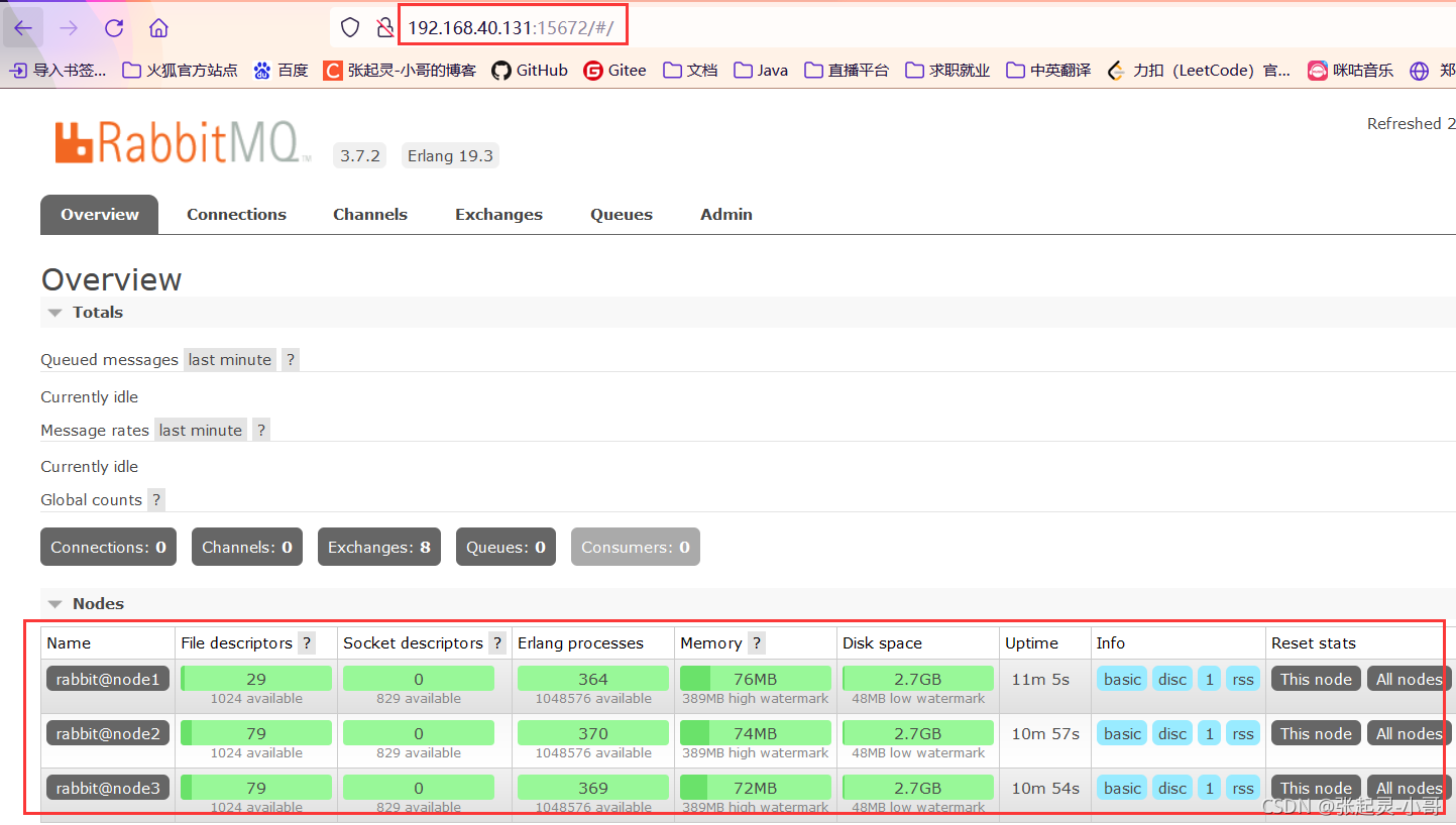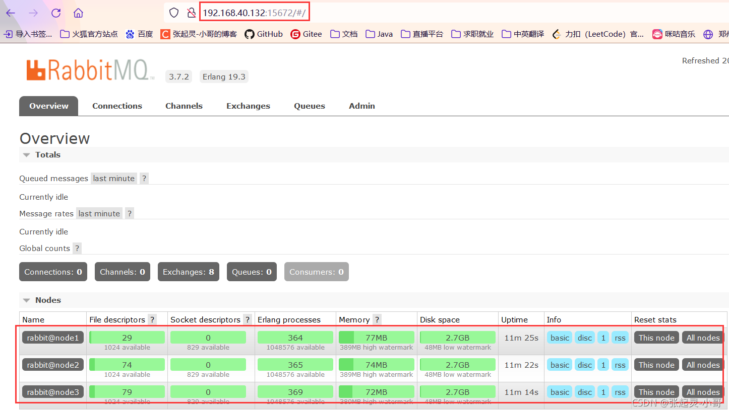至此,集群搭建就全部完成了,最后可以到浏览器中,访问RabbitMQ的后台web管理控制台了。可以看到集群信息完整的呈现出来了!!!