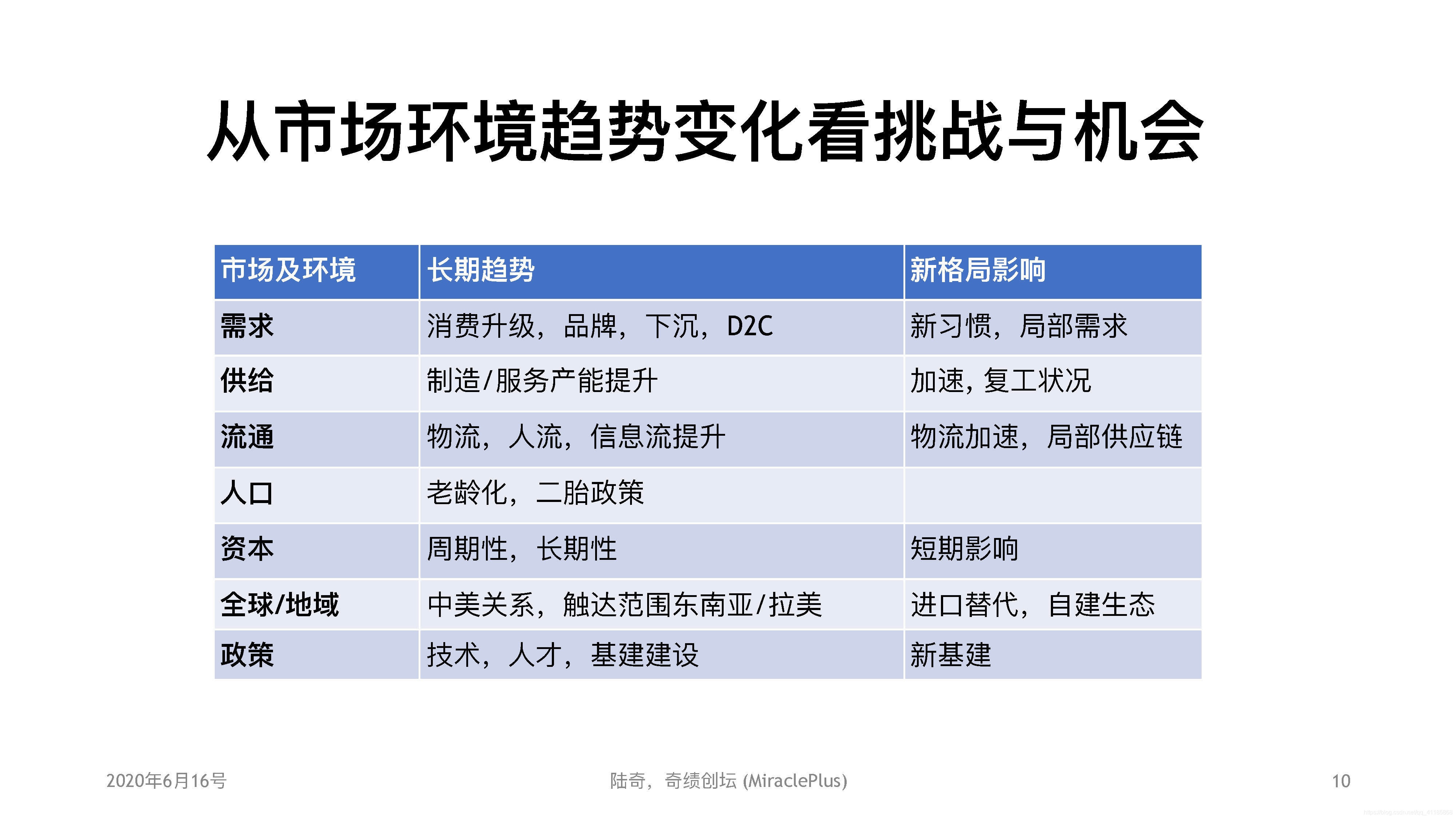 对企业自动化、智能化的新基建,新格局带来的进口替代,我们认为是个非常非常好的机会。产业互联网、物流的流通需求在增加,供应链和资金的流通短期内有可能受到新格局的部分影响。农业数字化、自动化在加速,机会很多。下面的企业数字化的基础建设,由于新格局所带来的全球的格局变化,在中国自建技术生态的需求,和新的基建等等带来了更多的发展产业的机会,对创业者来讲都是好的加速点。