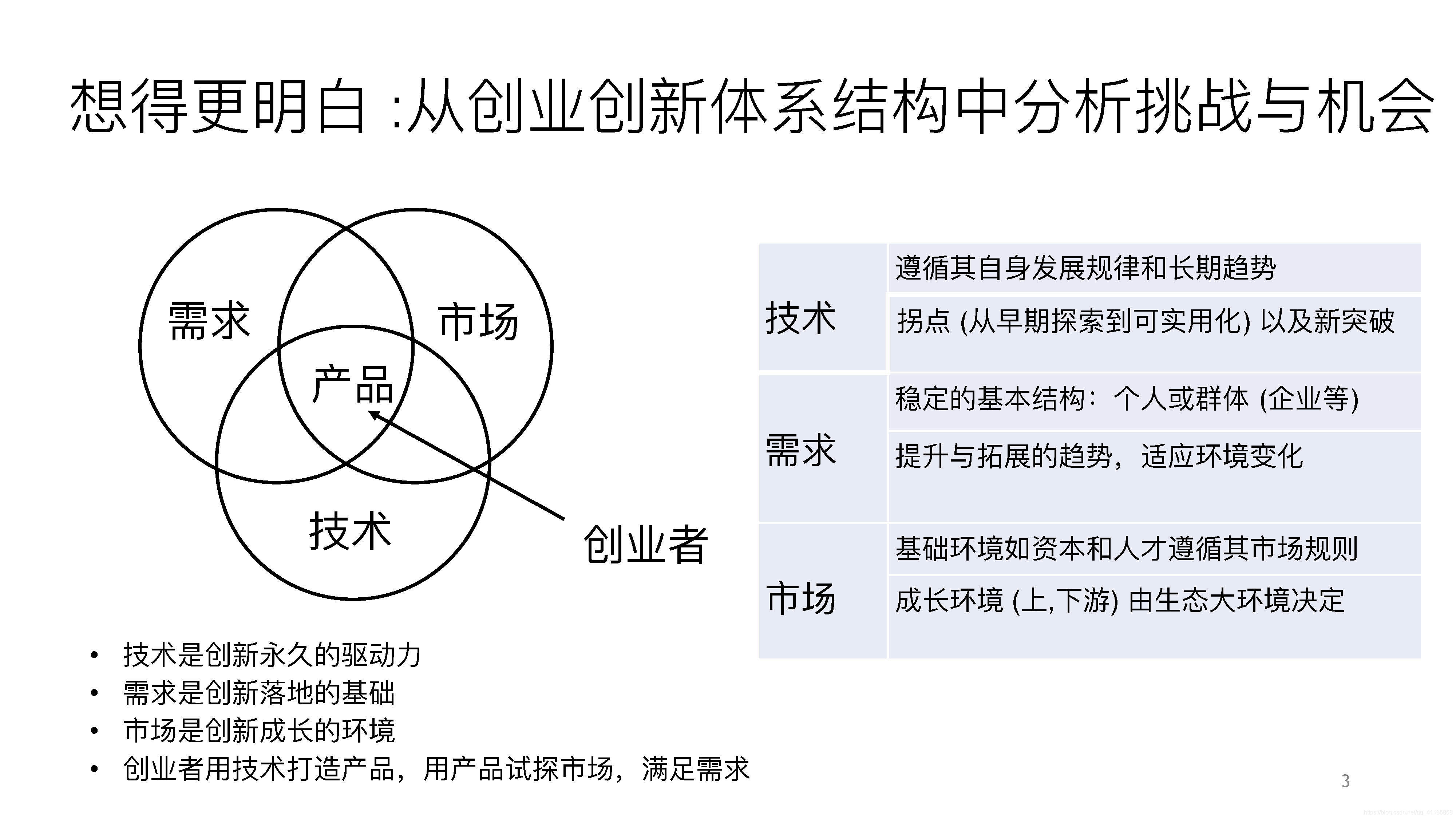 接下来跟大家分享我们如何仔细全面的分析这两个核心,第一个,想得更明白。如何想得更明白,起点是要抓住创业创新的体系结构,哪一些是不变的。创业创新有三大要素,这三个要素的有机结合不变。首先是技术,技术永远是创新最永久最强大的驱动力。第二是需求,光有技术没有用,必须有明确的需求,长期且大规模的需求,这是创新真正落地的一个基础。第三是要有市场环境,能够赚到钱,能够有盈利的能力,只有这样,一个好的创业才能长期生长。创业者本身的本质是用技术打造产品,用产品试探市场,来满足需求,所以,创业者核心要做的是要活得够长,可以把产品跟市场这个匹配跑通,这是不变的。