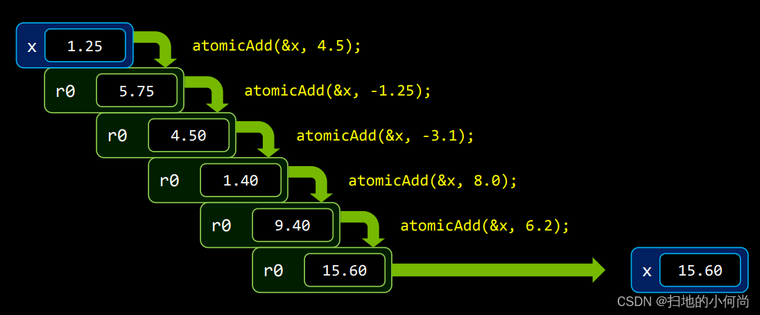 执行到这一步时, 有很多线程想读取X的值, 并加上另一个值. 如果你在你的Kernel程序最后面直接写 x=x+a, 那么当执行到这里的时候, 一个线程在读的时候, 可能另一个线程就在写. 这会产生未定义的错误.