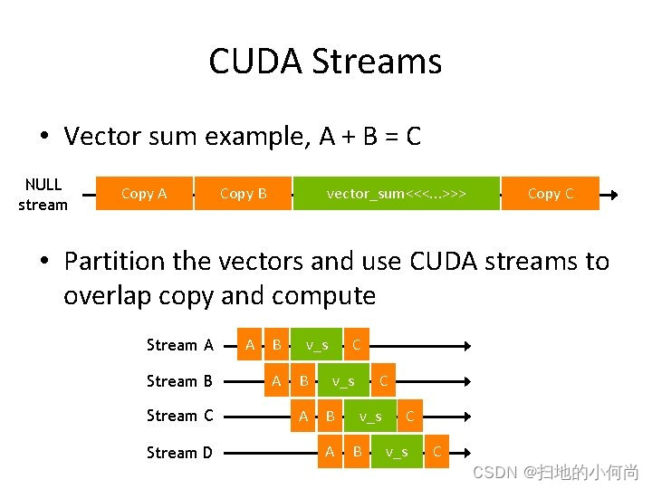 MyKernel<<<100, 512, 0, stream[i]>>>分别在stream[i]中执行. - 第三个for循环分别在两个stream中讲计算完成的结果传输给CPU内存.