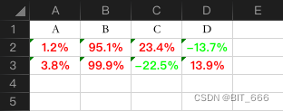 def colorFulData(_sheet, _head, _values): # 定义字体 _font = None # 获取 values 的长款 _colNum = len(_head) _rowNum = len(_values) # 定义对齐方式 _alignment = Alignment(horizontal="center", vertical="center", text_rotation=0, wrap_text=False) for _col in range(1, _colNum + 1): # col 转换并添加元素到 Cell _sheet[get_column_letter(_col) + str(1)] = head[_col - 1] _cell = _sheet.cell(1, _col) _cell.alignment = _alignment for _row in range(1, _rowNum + 1): # 保留一位小数 _sheet[get_column_letter(_col) + str(_row + 1)] = format(values[_row - 1][_col - 1], '.1%') _cell = _sheet.cell(_row + 1, _col) numValue = float(values[_row - 1][_col - 1]) # 根据值改变字体颜色 if numValue > float(0): _font = Font(name='黑体简', size=11, italic=False, color="00FF0000", bold=True) elif numValue < float(0): _font = Font(name='黑体简', size=11, italic=False, color="0000FF00", bold=True) _cell.font = _font _cell.alignment = _alignment head = ["A", "B", "C", "D"] values = [[0.012, 0.951, 0.234, -0.137], [0.038, 0.999, -0.225, 0.139]] colorFulData(sheet, head, values) workbook.save(file_path)