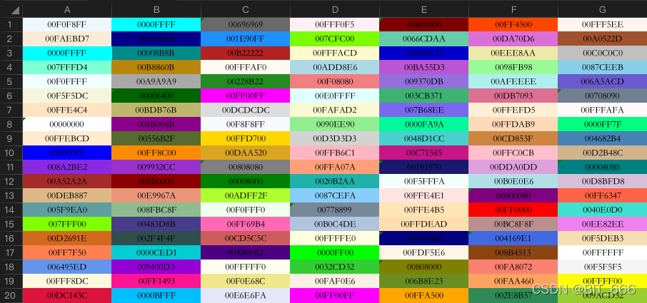 上面单元格的 color 或者是填充的 color 都用到了颜色代码,下面给出一些常用的颜色编码,有需要的可以应用到自己的程序内: