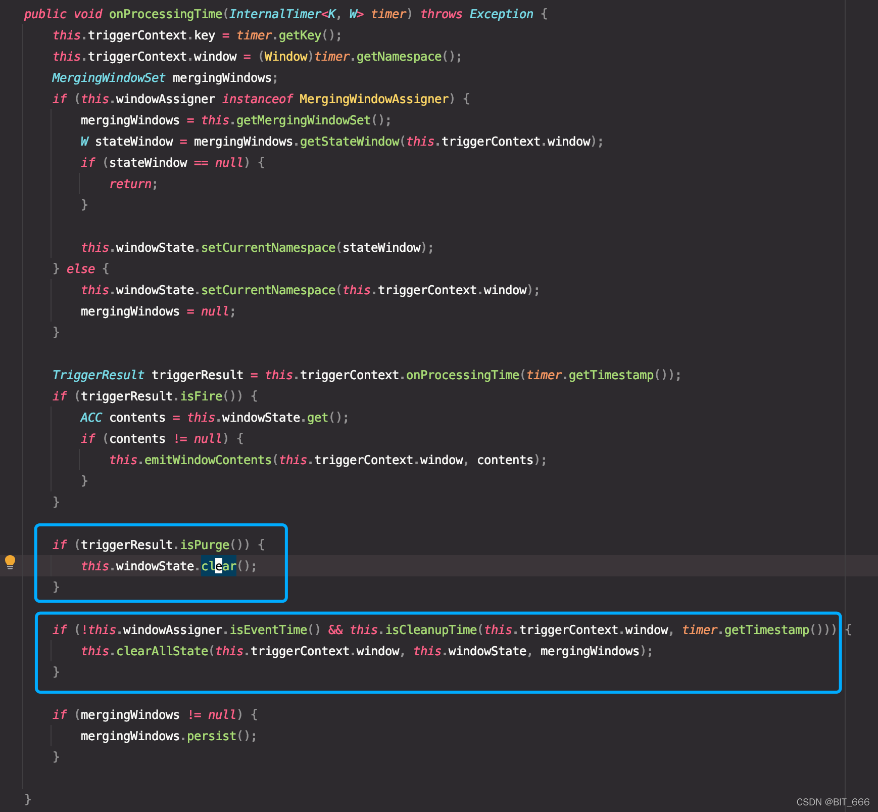 WindowOperator 作为所有窗口处理逻辑的入口,如果我们的 Trigger 返回 TirggerResult.FIRE,窗口会在到达 CleanupTime 时执行 clearAllState 方法清空当前 window 所有状态;如果返回 TriggerResult.FIRE_AND_PURGE,windowOperator 则会调用 Trigger @override 的 clear 方法,例如 ProcessingTimeTrigger 会将窗口的计时器清除,而本例如果返回 FIRE_AND_PURGE 则会同时清空 count 和 fireTimestamp 对应的两个 ReduceValue 的值: