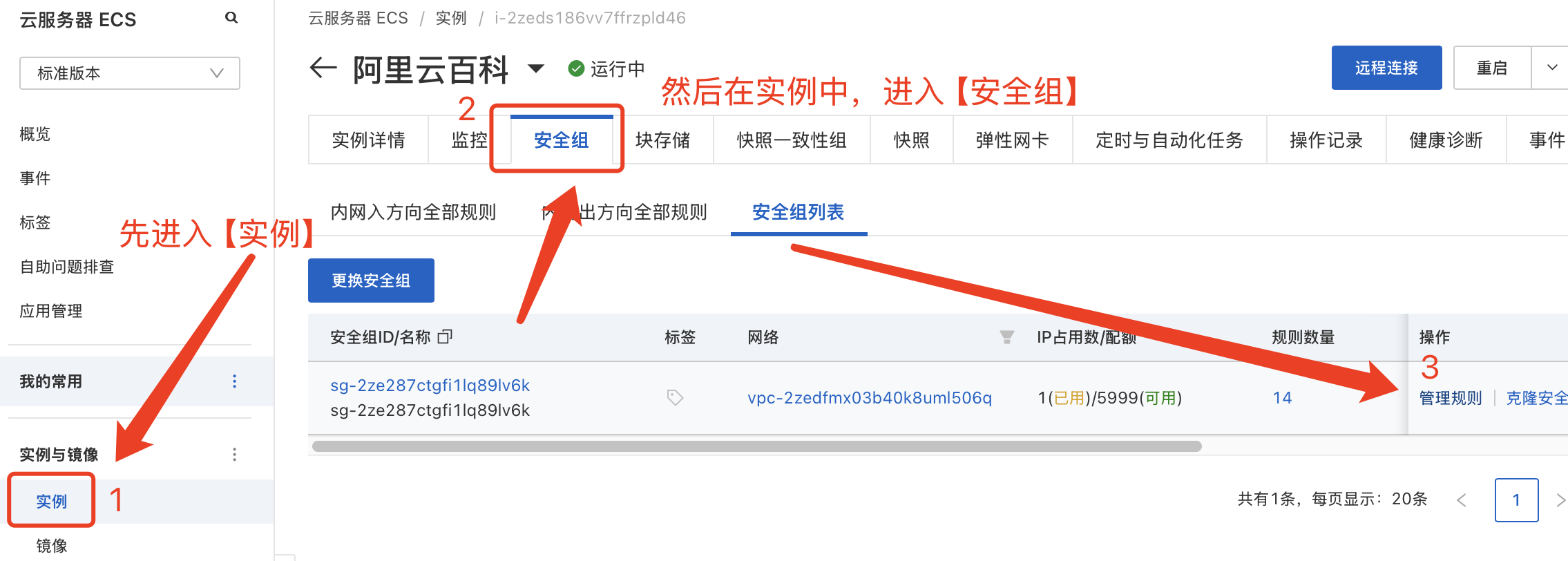 要定位到准确的安全组,如果ECS实例不再当前安全组下,就不管用了。关于安全组开端口教程参考:https://help.aliyun.com/zh/ecs/user-guide/manage-security-group-rules