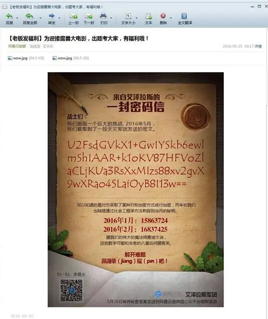 据说自从网易第一季度财报任性地碾压了互联网界小伙伴以后,三石哥的心情非常之好,除了在杭州的办公室听听俄罗斯rap,看看报表之外,还随手撰写了一小段密码信发布给网易全体程序员,想要考考大家。(悄悄告诉你)一名网易云信的程序员用了炒鸡短的时间就破解了这段密码,三石哥灰常开心地送了珍贵的魔兽限量版格罗玛什手办给他,无比壕气!他还放话说只要挑战成功的,无论是否是网易员工,人人有机会抽奖,一个不落。敢不敢来挑战一下?