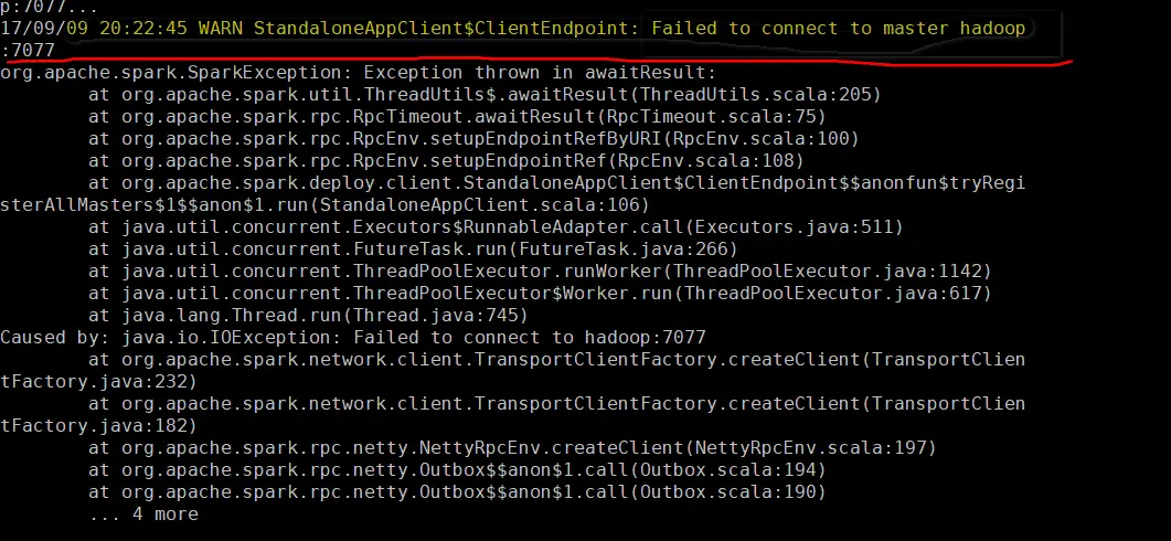 从异常上看,创建SparkContext连接的master节点是hadoop:7077,你要保证这个主机名hadoop能够正确被解析成ip地址,而且是运行了sparkstandalone的master服务