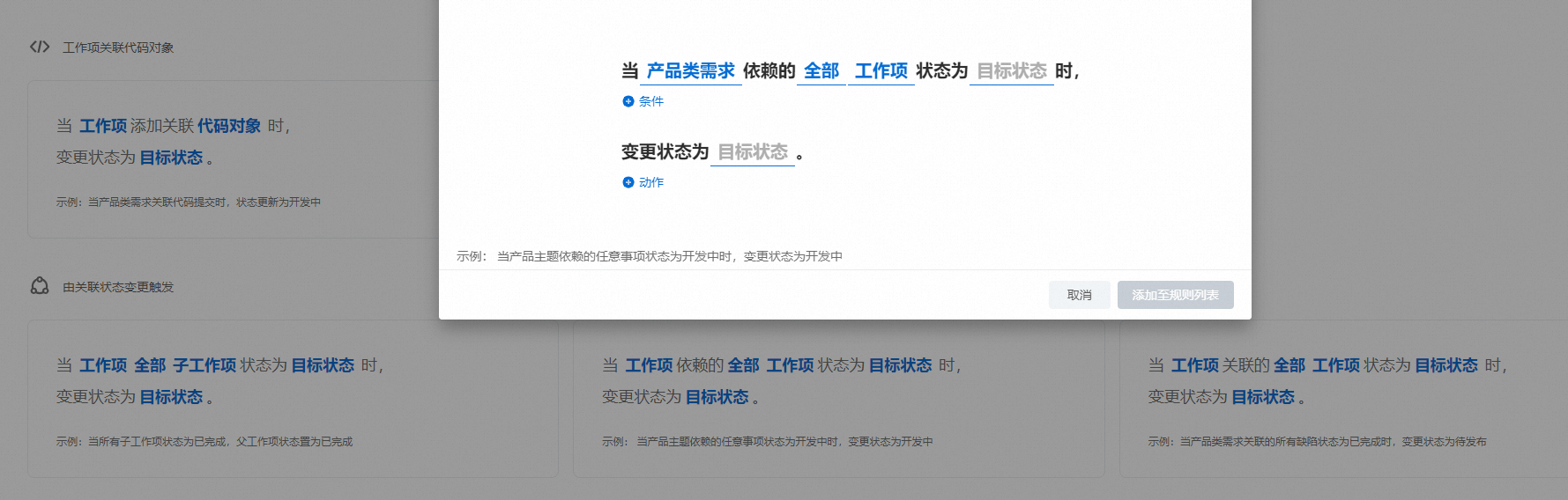 云效里面,我希望 依赖的子项状态 全部为设计完成时,修改父级工作项状态为 确认设计中,当父级工作项状态为 确认设计中时,再将全部子项状态修改为 待确认。 这个自动规则要如何设置?