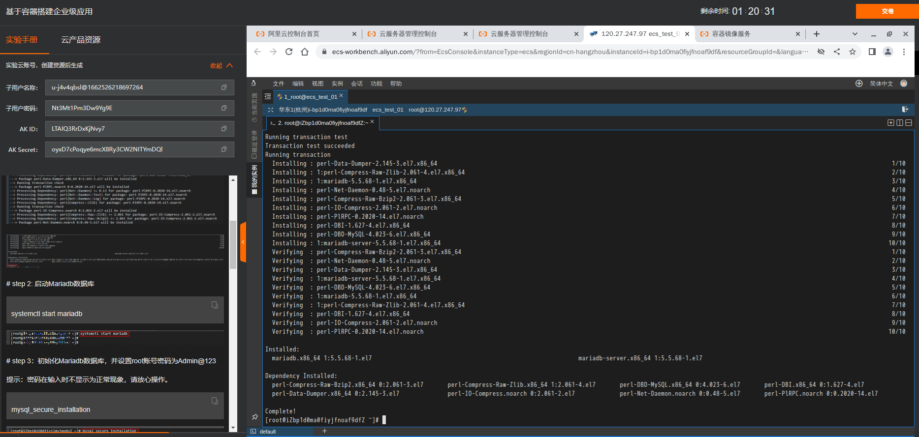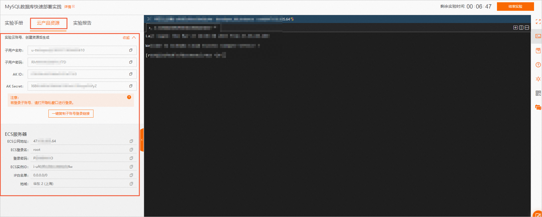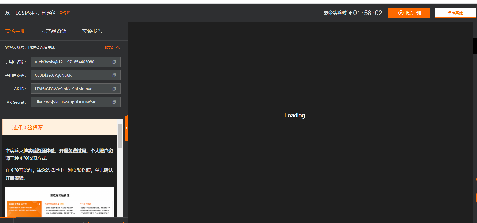 如果您选择的是实验资源体验,资源创建过程需要3~5分钟(视资源不同开通时间有所差异,ACK等资源开通时间较长)。完成实验资源的创建后,在实验室页面左侧导航栏中,单击云产品资源列表,可查看本次实验资源相关信息(例如子用户名称、子用户密码、AK ID、AK Secret、资源中的项目名称等)。