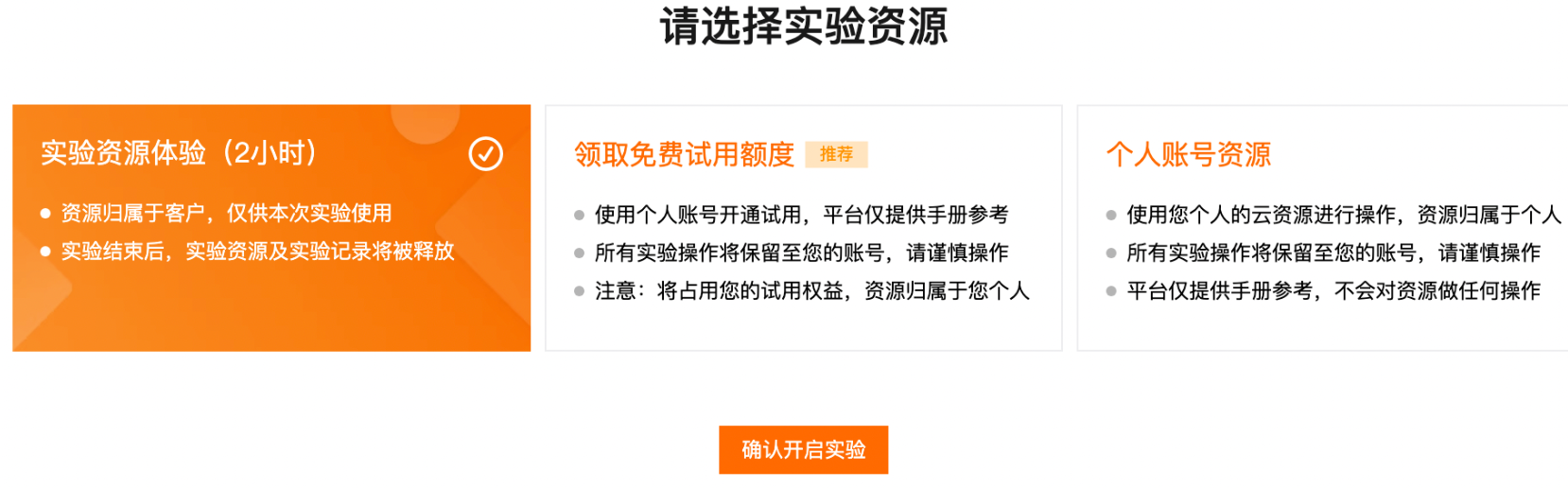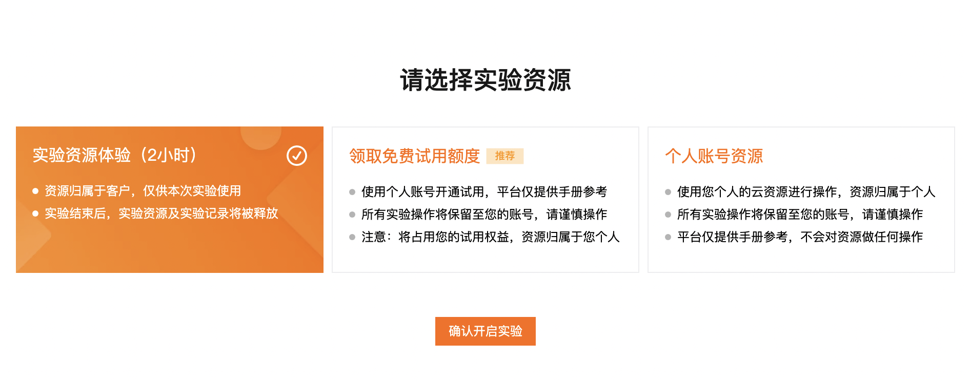 在实验开始前,请您选择其中一种实验资源,单击确认开启实验。