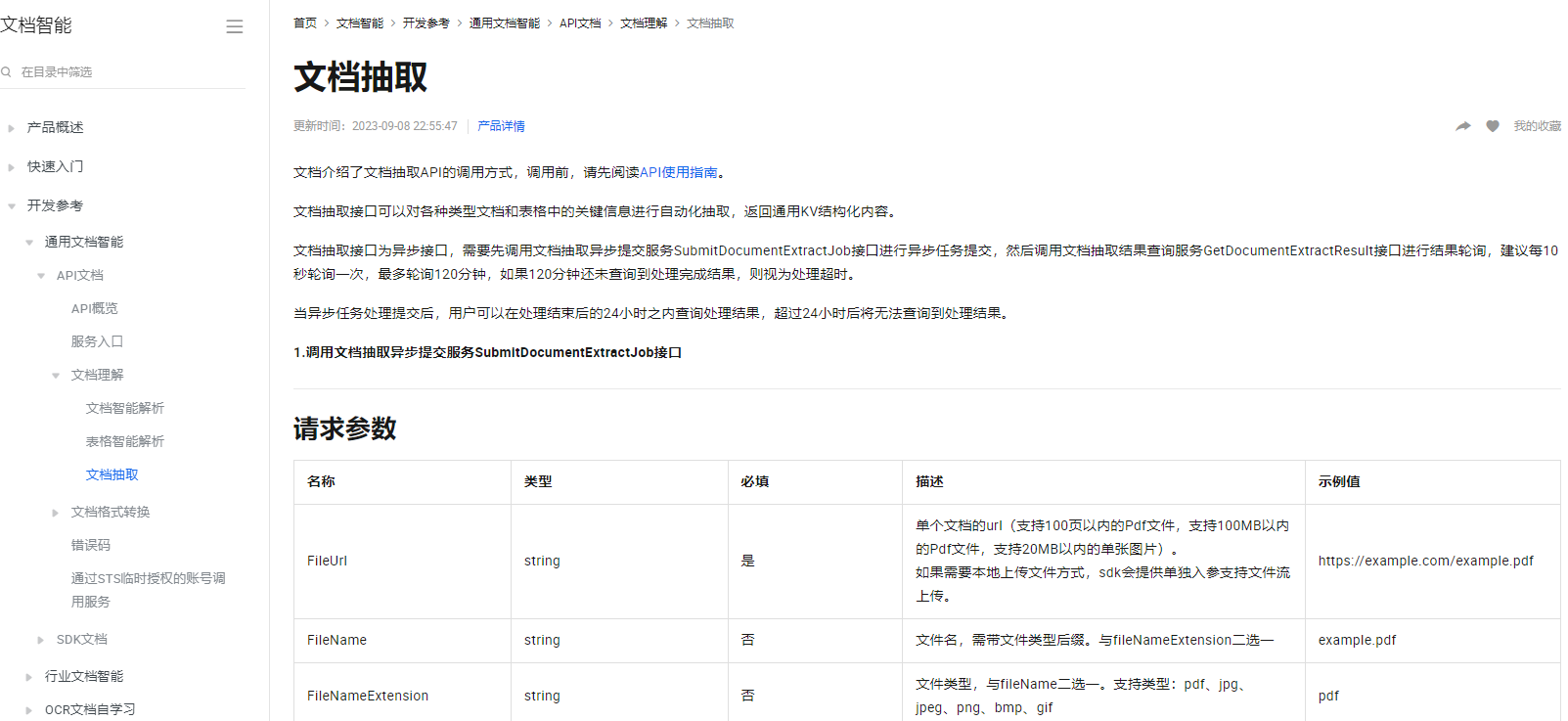 文档抽取接口为异步接口,需要先调用文档抽取异步提交服务SubmitDocumentExtractJob接口进行异步任务提交,然后调用文档抽取结果查询服务GetDocumentExtractResult接口进行结果轮询,建议每10秒轮询一次,最多轮询120分钟,如果120分钟还未查询到处理完成结果,则视为处理超时。