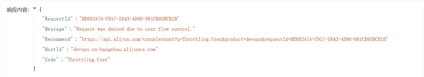 你可以按照推荐的链接去查看详细的解决步骤:https://api.aliyun.com/troubleshoot?q=Throttling.User&product=devops&requestId=BE683A7A-C917-5843-AD98-861CB95BCB1B