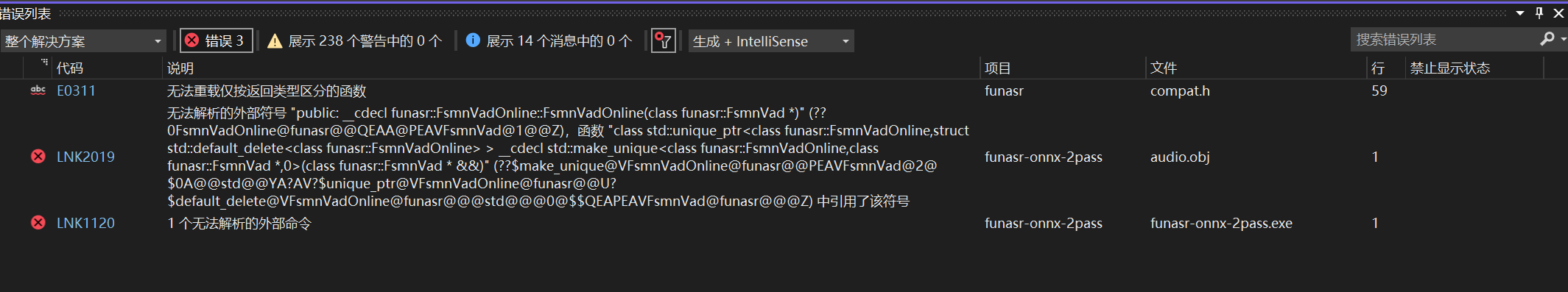 modelscope-funasr的vs2022编译报很多链接错误,请问用什么版本的vs编译比较好?另外是否需要改链接参数